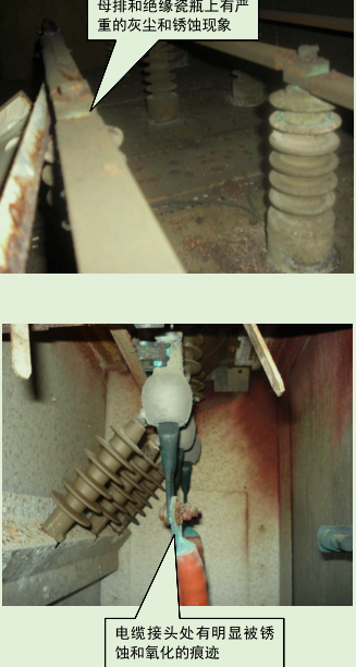 检测完毕后,我公司技术人员通过观察窗查看有无放电痕迹时发现,检测有局放开关柜均能看到蓝弧光,局放很严重。开柜后柜内的情况见下图