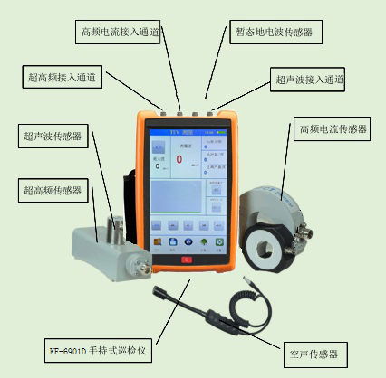 KF-6901D是一款手持式5通道局部放电巡检测试仪器,根据不同的配置可以提供暂态地电压(TEV)、空气式超声波(AA)、接触式超声波(AE)、高频电流(HFCT)、超高频(UHF)5种检测方式;同时提供温度、湿度、气压值的环境测量。暂态地电压(TEV)和空气式超声波(AA)的检测模式,可以对开关柜、电缆桥架、电缆接头和架空线路的绝缘子、柱上开关等设备进行局放检测与定位;高频电流(HFCT)检测模式可以对变压器、电缆进行局放检测;超高频(UHF)和接触式超声波(AE)检测模式可以对GIS设备进行局放检测。检测结果以数字和图形的方式显示放电强度、放电相位等。