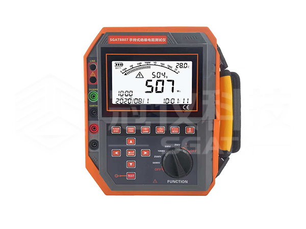 SGAT8807手持式绝缘电阻测试仪,又名兆欧表、高压兆欧表、高压绝缘电阻测试仪等,专用于试验室或现场做绝缘测试。本仪表具有 LCD 大屏幕灰白背光显示、数据存储、数据查阅等功能。同时还具自动计算吸收比和极化指数,并自动储存15秒、30秒、1分钟、10分钟数据。分辨率高,操作便捷,携带方便,准确、可靠、性能稳定,抗干扰能力强。而且具有防震、防尘、防潮结构,是电信、电力、气象、机房、油田、机电安装和维修以及利用电力作为工业动力或能源的工业企业部门常用而必不可少的仪表。它适用于测量各种绝缘材料的电阻值及变压器、电机、电缆及电器设备等的绝缘电阻。数字绝缘电阻表由中大规模集成电路组成,内含高精度微电流测量系统、数字升压系统、自动放电电路。只需要用一条高压线和一条信号线连接被测物即可测量。测量自动进行,结果由大屏幕显示,并将结果进行存储。额定输出测试电压范围250V~5000V,绝缘电阻测量范围0.01MΩ~5.00TΩ。直流电压测量范围0V~1000V DC,交流电压测量范围0V~750V AC。